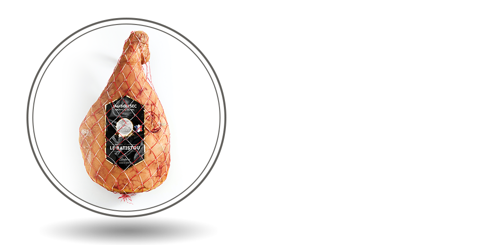 Our dry-cured hams are prepared using only fresh, carefully selected French meat. The round cut is inspired by the "Parma" cut. Rubbed by hand with dry salt, they are then dried and matured for at least 9 months to bring out all their flavours.
