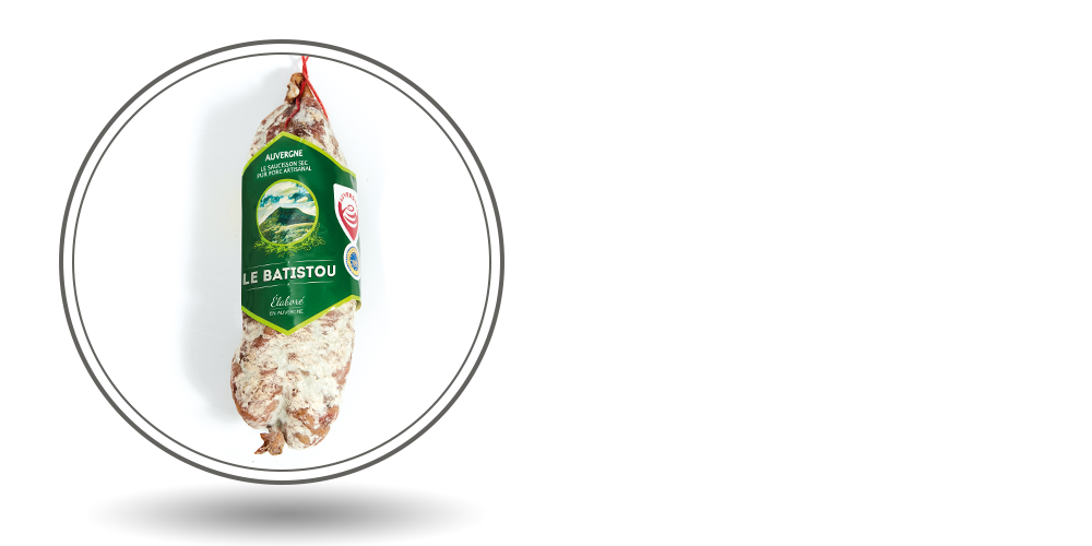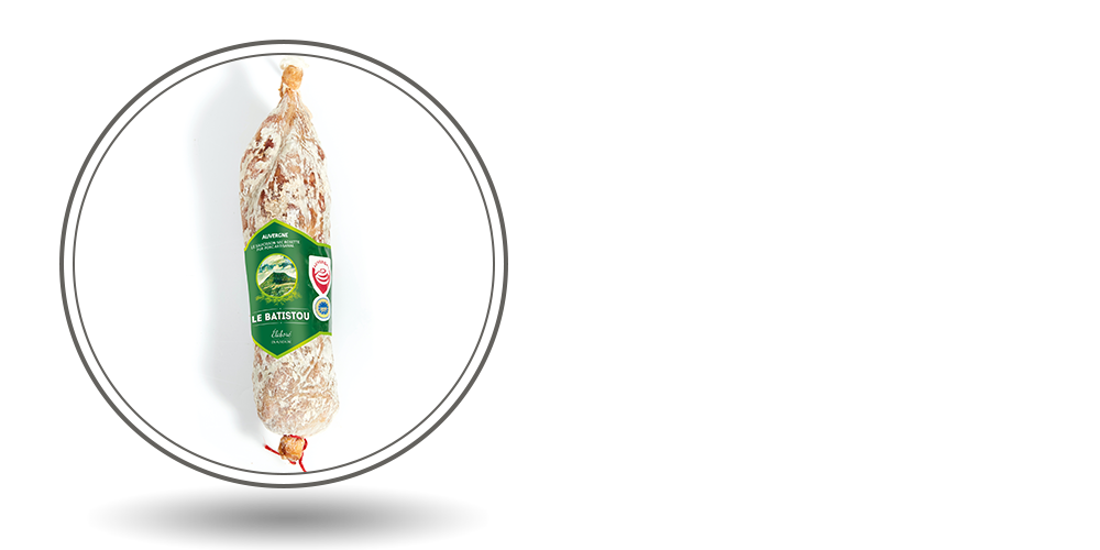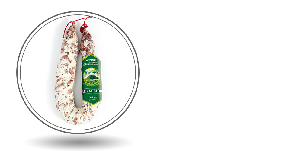 Discover the entire personality of the Auvergne mountains! Le Batistou has teamed up with Les Salaisons Bernard to offer you rosettes, dry sausages, “brides” and curved sausages made in the heart of a small Auvergne village. A range of artisanal dry sausages, certified by the Protected Geographical Indication (PGI) Auvergne. It is also certified bythe “Ma Région, sesterroirs” label, an initiative of the Auvergne Rhône Alpes region, which guarantees its regional origin. Les Salaisons Bernard are attached to a tradition of buying animals. They work in a short circuit with a slaughterhouse in Yssingeaux(43), where the pigs come from local farms. Each week, the carcasses of the fresh pigs are received, boned and prepared by our butchers before being processed into dry sausages and other specialities. The products are then stuffed into natural pork casings, and placed in traditional wooden drying sheds that encourage the development of a natural grey-green bloom.